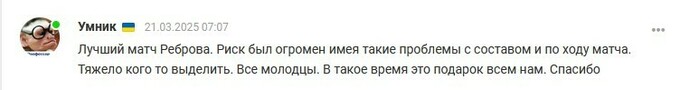 Умник: Найкращий матч Реброва. Ризик був величезний маючи такі проблеми зі складом та в ході матчу. Тяжко когось виділити. Усі молодці. У такий час це подарунок для всіх нас. Дякую.