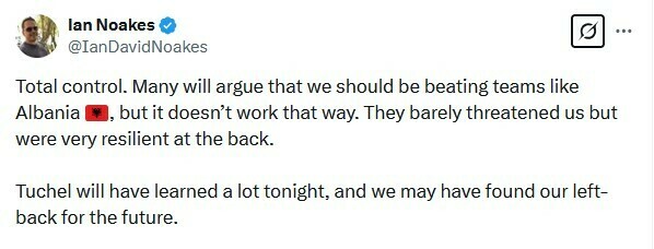Ian Noakes: Повний контроль. Багато хто буде стверджувати, що ми повинні перемагати такі команди, як Албанія 🇦🇱, але так це не працює. Вони майже не загрожували нам, але були стійкими в обороні. Тухель багато чому навчився сьогодні ввечері, і ми, можливо, знайшли свого лівого захисника на майбутнє.