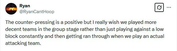 Ryan: Контрпресинг — це добре, але мені дуже хотілося б, щоб на груповому етапі ми грали з більш пристойними командами, а не просто постійно грали проти слабких суперників, а потім нас продавлювали, коли ми грали зі справжньою атакуючою командою.