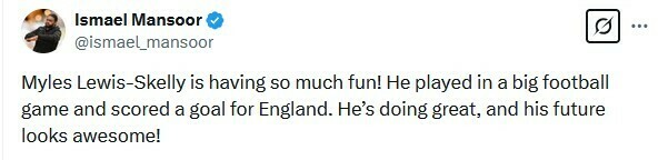 Ismael Mansoor: Майлз Льюїс-Скеллі так весело проводить час! Він зіграв у великому футбольному матчі і забив гол за збірну Англії. У нього все чудово, і його майбутнє виглядає чудовим!