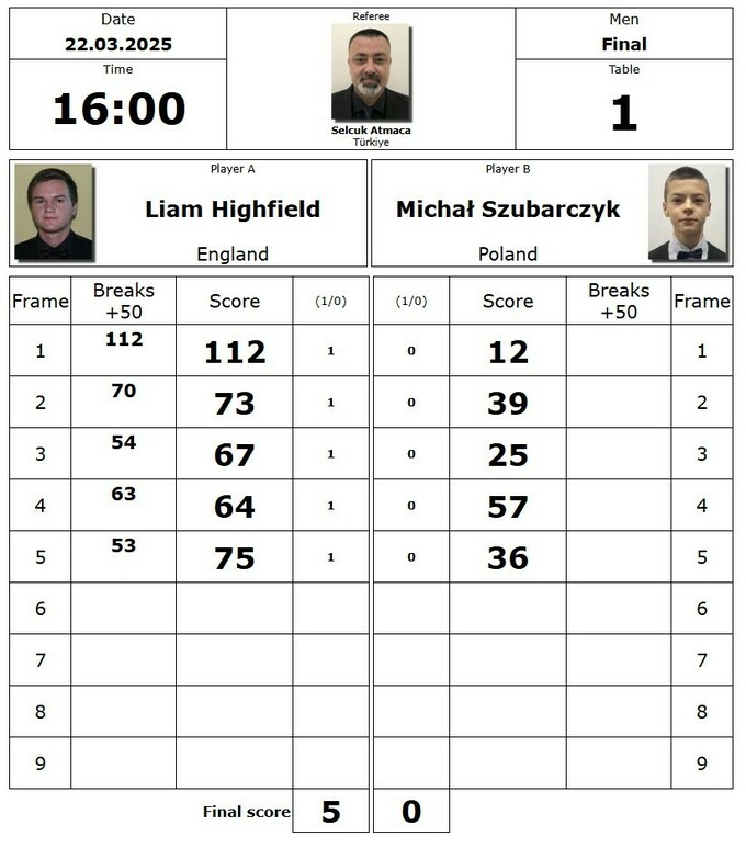 Ліам Хайдфілд (Англія) – Міхал Шубарчик (Польща) – 5:0
