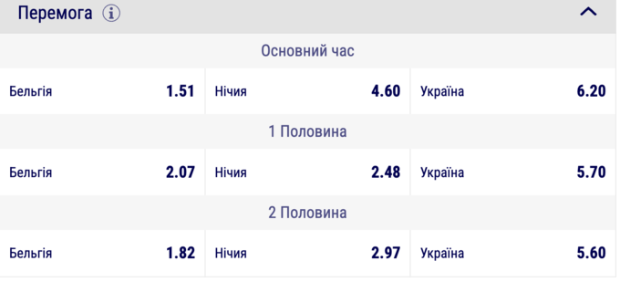 Однак «синьо-жовті» є фаворитами на загальний успіх. Коефіцієнт на те, що Україна повернеться у Дивізіон А Ліги націй – 1.44, на прохід Бельгії – 2.93.