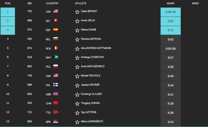 Срібло змагань взяла швейцарка Аннік Келін – 6.83 м, а третю сходинку п'єдестала зайняла Фатіма Діаме (6.72 м).