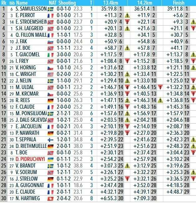 У топ-3 також увійшли Ерік Перро із Франції (1 промах) та Ендре Стремсхейм із Норвегії (чиста стрільба).