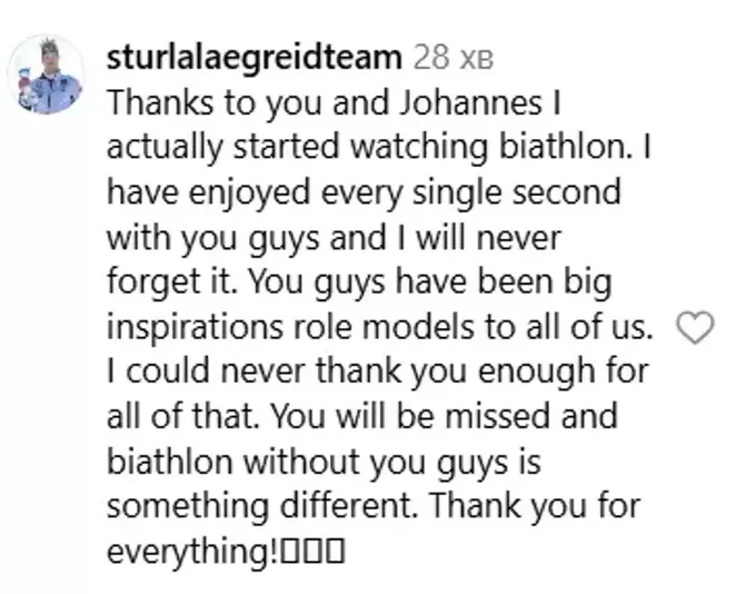 «Завдяки тобі та Йоганнесу я взагалі почав дивитися біатлон. Я насолоджувався кожною секундою разом із вами і ніколи цього не забуду. Ви стали великою мотивацією та справжніми зразками для всіх нас.