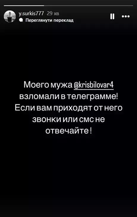 Яна Суркіс написала: «Мого чоловіка зламали в Телеграмі. Якщо вам надходять від нього повідомлення або дзвінки, не відповідайте!».