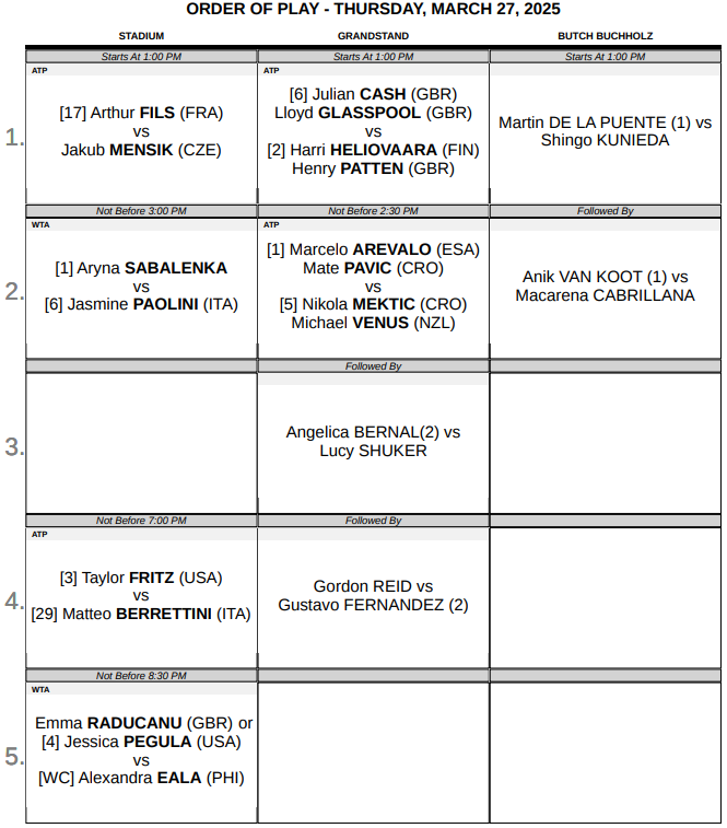 У підсумку організатори вирішили перенести поєдинок Джоковича і Корди на вечір 27 березня, оскільки у Флориді зараз надто пізно (00:00) і за правилами АТР після 23:00 жодних матчів бути не може. Гра відбудеться 3-м запуском після зустрічі Соболенко – Паоліні.