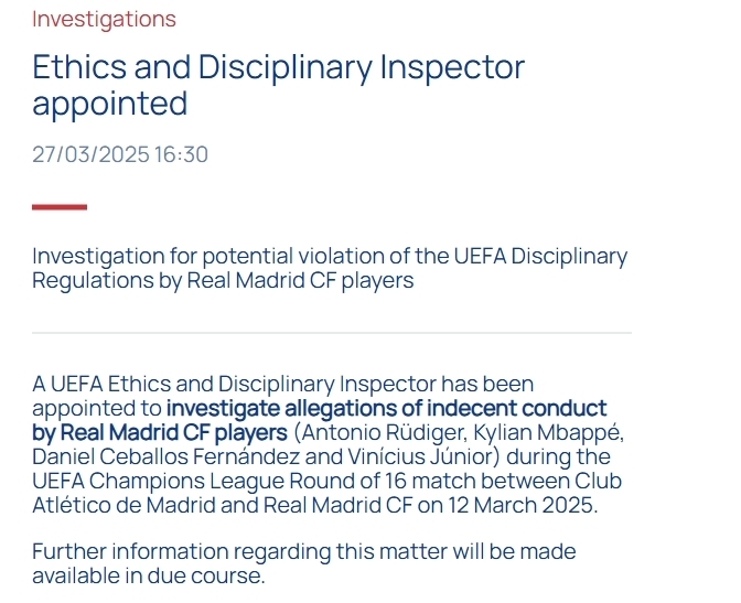 УЄФА на офіційному сайті повідомив про відкриття дисциплінарної справи проти гравців Реала Антоніо Рюдігера, Дані Себальоса, Вінісіуса Жуніора та Кіліана Мбаппе.