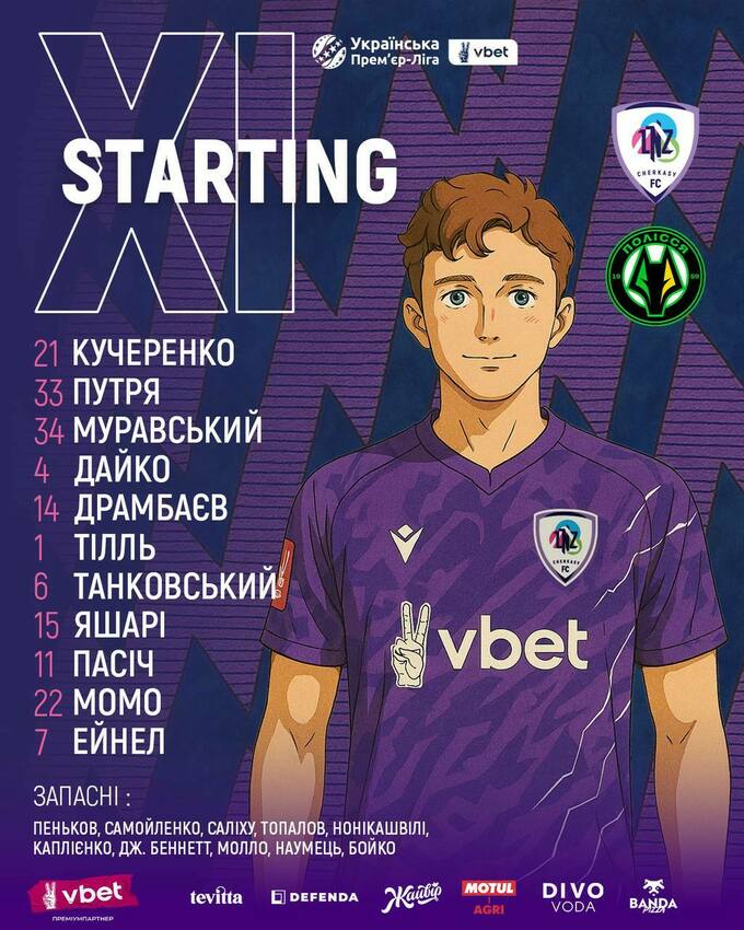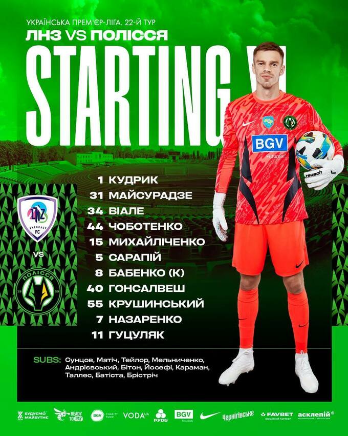 «Полісся»: Кудрик – Михайліченко, Сарапій, Чоботенко, Віале, Майсурадзе (Тейлор, 87) – Назаренко (Брістрич, 86), Крушинський (Бітон, 64), Бабенко, Гонсалвеш (Батіста, 64) – Гуцуляк (Мельниченко, 90+2).