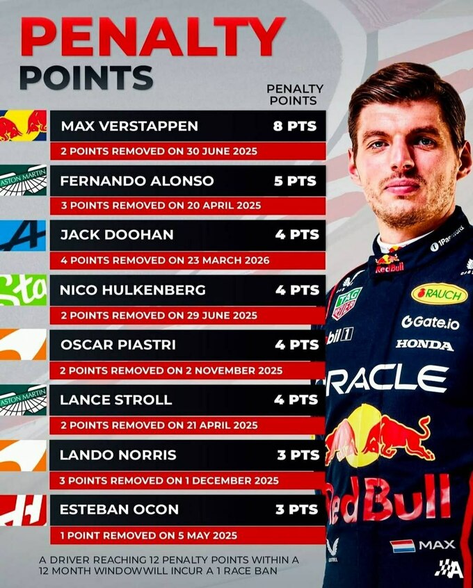 Серед діючих гонщиків найбільше штрафних балів наразі має Макс Ферстаппен – у його активі 8 балів. Найближчі з них згорають лише 30 червня, що залишає нідерландця під загрозою отримання додаткових санкцій. Як показав нещодавній випадок з Джеком Дуеном у Китаї, штрафні бали можна отримати дуже швидко – іноді достатньо лише одного вікенду.