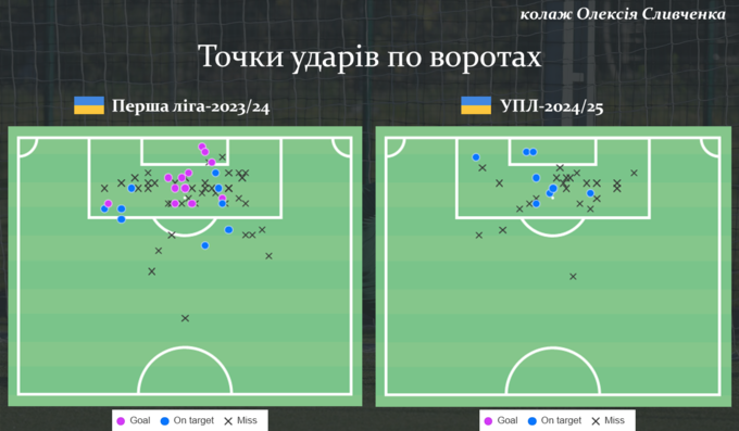 Водночас, навіть із таким статистичним «просіданням» рівень гри Ігора Невеса в УПЛ все одно дозволяє форварду розраховувати на забиті м'ячі. І справа не тільки в теоретичному показнику очікуваних голів (xG), який у бразильця в цьому сезоні дорівнює 0,37, а й загалом у статистиці ударів. На практиці в УПЛ Невес завдає лишень на 25% менше ударів по воротах суперників, аніж це йому вдавалося робити у Першій лізі. Точність обох порівнюваних показників практично ідентична, а також за допомогою графіки нижче ми можемо чітко простежити, що бразилець, як і роком раніше, намагається пробивати виключно з «улюбленої» зони – центру штрафного майданчику. Але якщо минулого сезону в нього залітало багато м'ячів, то зараз – ні…