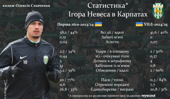 Таким чином, ми бачимо, що загалом кваліфікації Ігору Невесу для того, аби бути, як мінімум, досить успішним на рівні УПЛ вистачає, так само як і гольових нагод для як мінімум 4-6 забитих м'ячів у чемпіонаті. Однак за фактом ми маємо картину, за якої найкращий голеадор «Карпат» у Першій лізі-2023/24 за 1277 хвилин в рамках 21 поєдинку УПЛ-2024/25 так і не забив жодного м'яча, маючи у пасиві два нереалізовані пенальті.