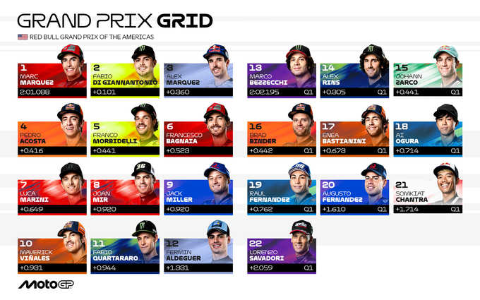 За підсумками кваліфікації з першого ряду стартуватимуть восьмиразовий чемпіон світу Марк Маркес із заводської команди Дукаті, а також двоє райдерів приватних команд на мотоциклах італійського бренду – Фабіо Ді Джаннантоніо із VR46 та Алекс Маркес із Gresini.