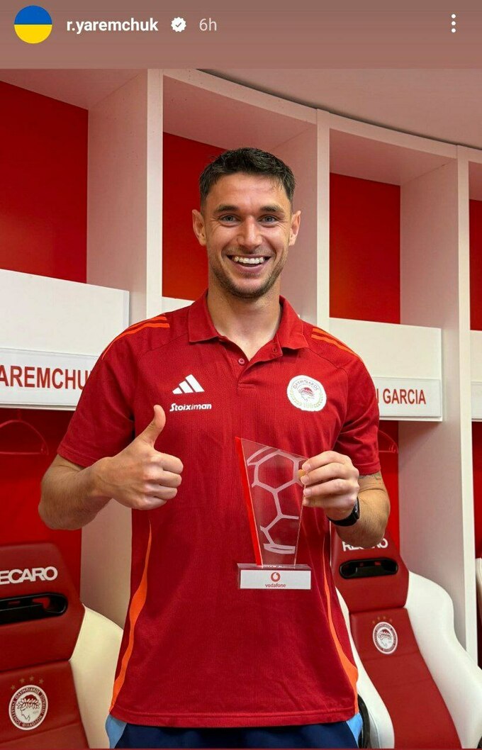 У цій грі національної збірної України Роман Яремчук відзначився дублем у складі «Олімпіакоса». Після поєдинку в Instagram-stories футболіст поділився світлиною з нагородою найкращому гравцю зустрічі.