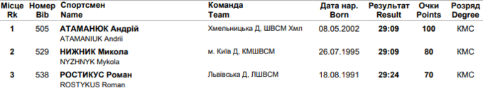 У чоловічій гонці був зафіксований унікальний випадок. Андрій Атаманюк і Микола Нижник одночасно перетнули фінішну пряму, тому долю переможця визначив фотофініш. У підсумку, чемпіоном став Атаманюк, а другим – Нижник, їх однаковий результат склав 29:09 хв. Третім фінішував Роман Ростикус – 29:24.