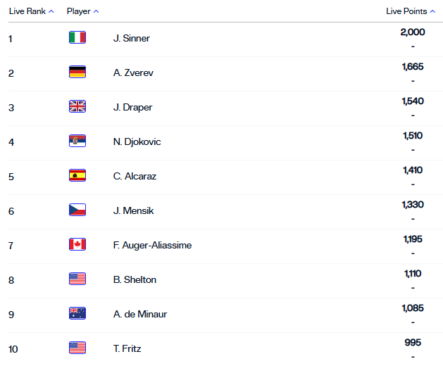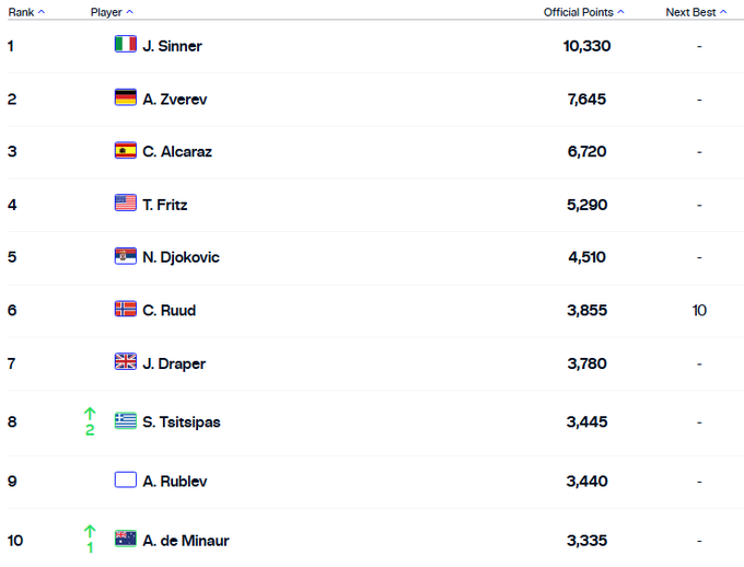 Зі змін у першій десятці: Стефанос Циципас піднявся з 10-го на 8-ме місце, Алекс де Мінаур повернувся на 10-ту сходинку, а Данііл Медведєв опустився на 11-ту позицію.