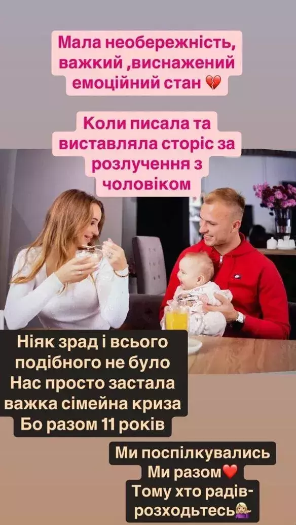 «Я допустила необережність, перебуваючи у важкому емоційному стані. Жодних зрад не було, ми просто пережили сімейну кризу. Ми поговорили і залишилися разом. Тому, хто радів нашому розриву – розходьтеся», – зазначила Катерина.
