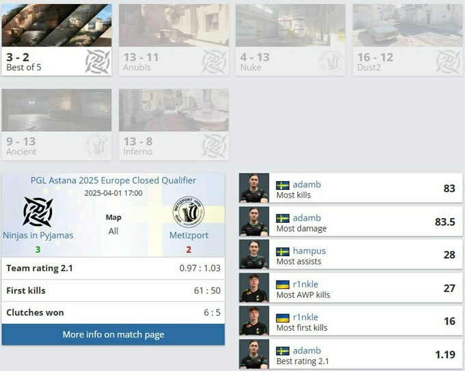 Кваліфікація на PGL Astana могла завершитися для Ninjas in Pyjamas ще на початкових етапах. Вони програли одну карту Hesta у четвертому відкритому відборі та поступалися 4:12 на другій, але зуміли здійснити камбек, вигравши в овертаймі і на вирішальній карті.