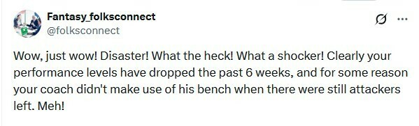 Fantasy_folksconnect: Ого, просто ого! Катастрофа! Що за фігня! Який шок! Очевидно, що рівень вашої результативності за останні 6 тижнів впав і з якоїсь причини ваш тренер не скористався лавкою запасних, коли ще залишалися нападники. Мда!