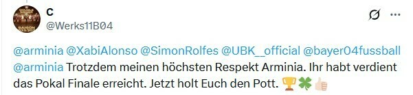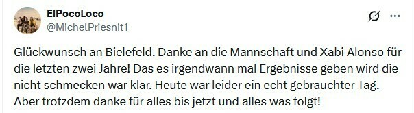 ElPocoLoco: Вітаємо Білефельд. Дякую команді та Хабі Алонсо за останні два роки! Було ясно, що в якийсь момент результати будуть гіршими. На жаль, сьогодні був справді поганий день. Але все одно дякую за все, що сталося досі і за все, що буде!