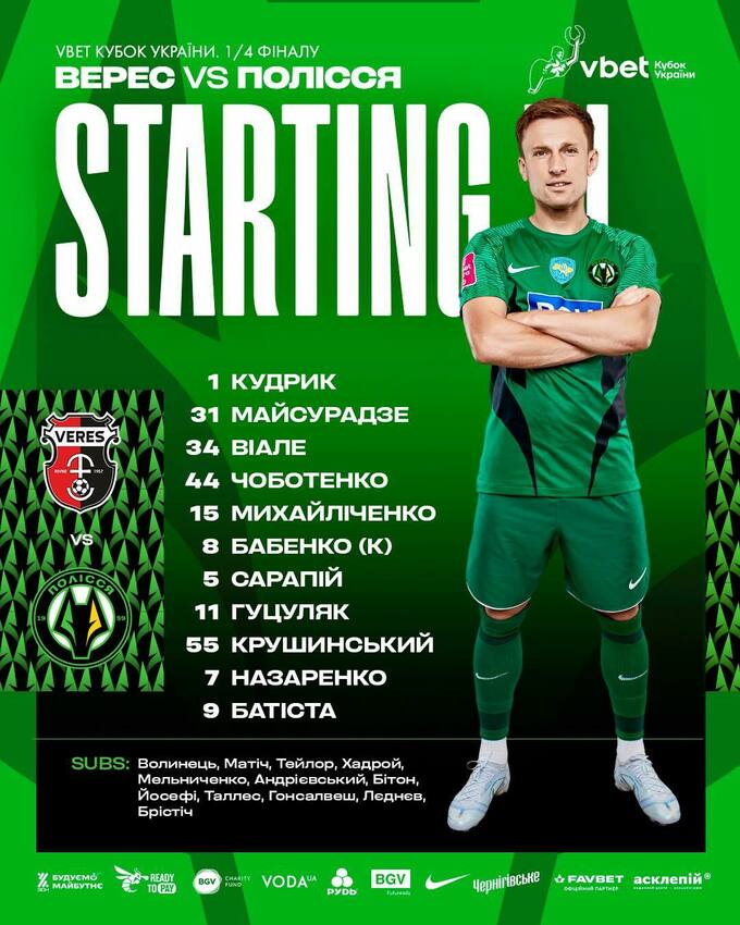 Полісся: Кудрик, Майсурадзе, Віале, Чоботенко, Михайличенко, Бабенко, Сарапій, Крушинський, Гуцуляк, Назаренко, Батиста