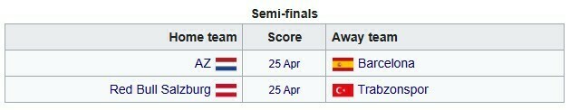 У півфіналі 25 квітня у швейцарському Ньоні зіграють: АЗ Алкмар – Барселона, РБ Зальцбург – Трабзонспор. Фінал пройде там же 28 квітня.