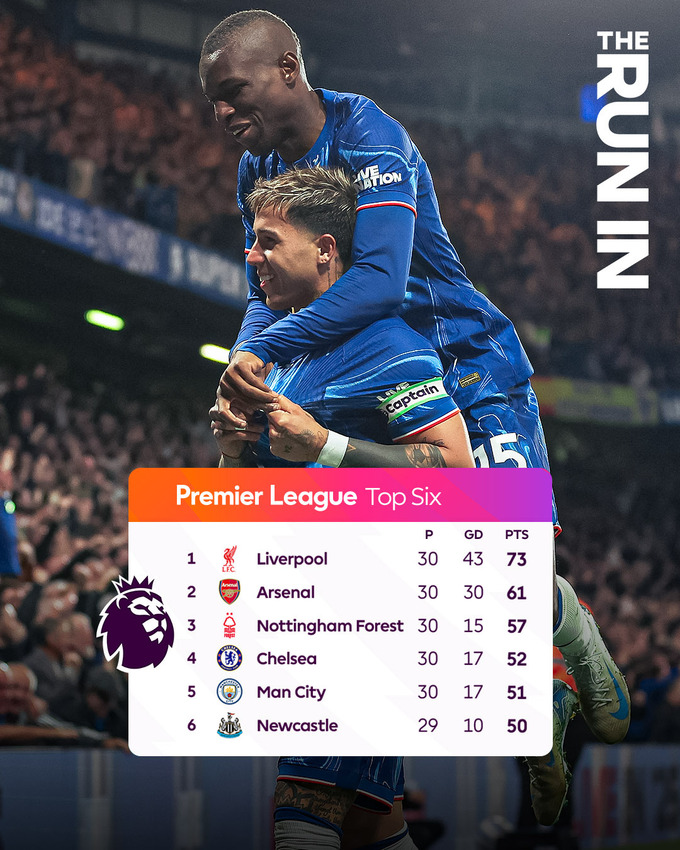 Топ-7 АПЛ: Ліверпуль (73), Арсенал (61), Ноттінгем Форест (57), Челсі (52), Манчестер Сіті (51), Ньюкасл (50), Астон Вілла (48).