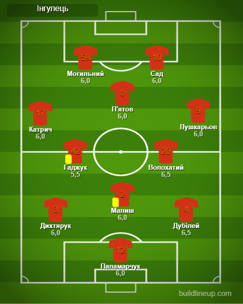 «Інгулець»: Паламарчук – Дихтярук, Малиш, Дубілей (Бенедюк, 66) – Катрич (Фарасєєнко, 80), Гаджук (Лосенко, 46), Волохатий, Пушкарьов (Чабан, 87) – П’ятов – Сад, Могильний (Кисленко, 66)