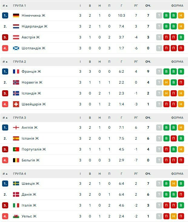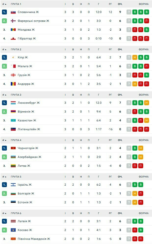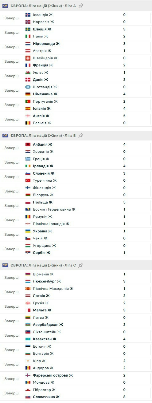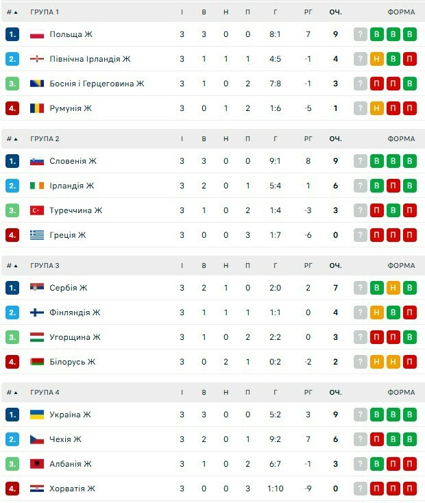 Таблиці жіночої Ліги націй. Україна з трьома перемогами стала лідером групи