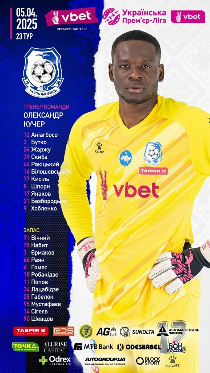 «Чорноморець»: Аніагбосо, Скиба, Ракіцький, Жаржу, Кисіль, Бутко (к), Шпори, Білошевський, Янаков, Безбородько, Хобленко