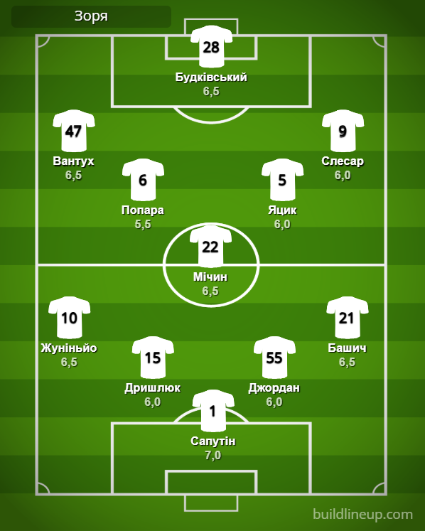 «Зоря»: Сапутін – Жуніньйо (Горбач, 80), Дришлюк, Джордан, Башич – Попара, Мічин, Яцик (Антюх, 46) – Вантух, Будківський, Слесар (Кирюханцев, 70).