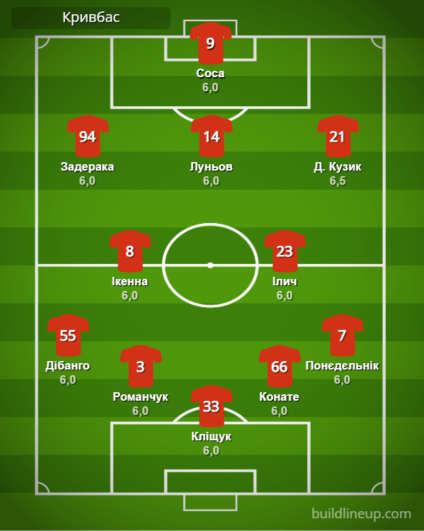 «Кривбас»: Кліщук – Дібанго, Романчук, Конате, Понєдєльнік – Ікенна, Ілич – Задерака (Аморозо, 67), Луньов (Мендоза, 66), Д. Кузик – Соса.