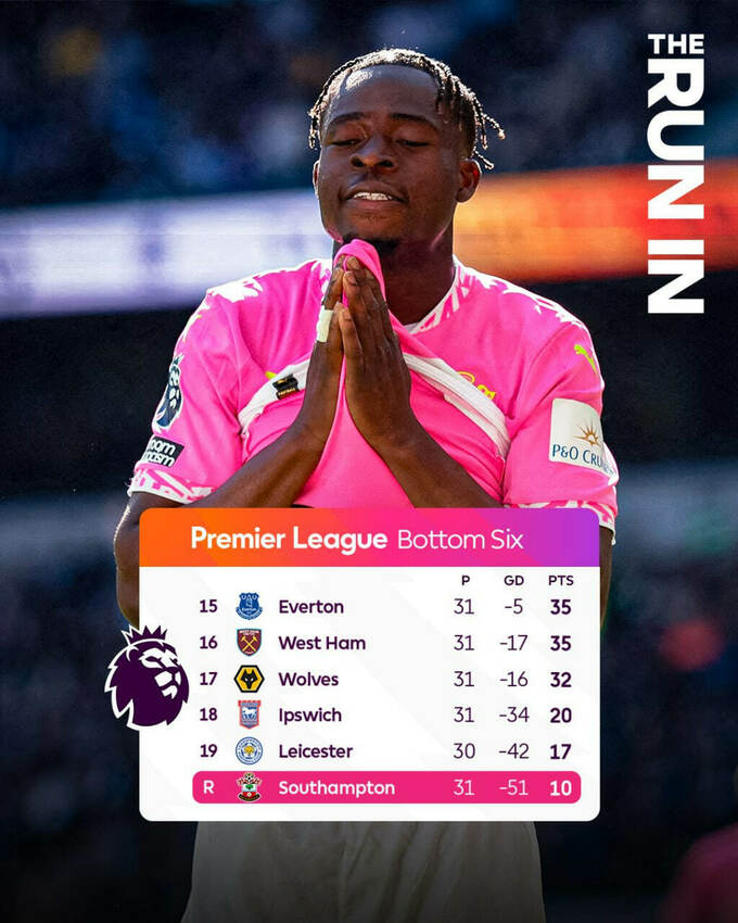 За 31 тур Саутгемптон зумів набрати лише 10 очок і розташовується на останньому, 20-му місці. Щоб залишитися в АПЛ, потрібно посісти 17-те або вище місце. Наразі 17-м іде Вулверхемптон із 32 пунктами.