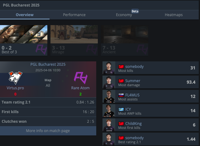 Китайський колектив Rare Atom здобув впевнену перемогу над фаворитом Virtus.pro у стартовому матчі швейцарської стадії PGL Bucharest. Це перша поява команди на турнірі рівня Tier-1 після мейджору в Шанхаї.
