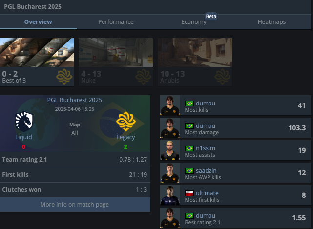 На Anubis Едуардо «dumau» Волькмер і Лукас «lux» Менегіні зробили ключовий внесок, а Бруно «latto» Ребелатто поставив крапку в матчі шикарним 1v3-клатчем. Liquid знову страждали від своїх постійних проблем із серединою раунду та неузгодженістю дій.