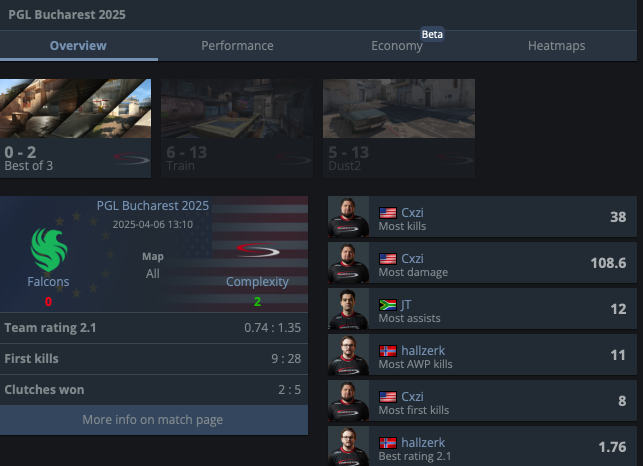 Гокан «hallzerk» Ф'єрлі показав клас із AWP, а новачки Нік «nicx» Лі та Денні «Cxzi» Стшелчик демонстрували розумну гру та мультикіли. Falcons виглядали знесиленими, що, ймовірно, пов’язано з очікуваним трансфером Абдула «degster» Гасанова.