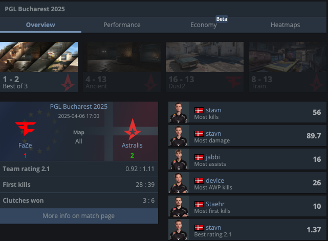 Після втрати переваги 11:5 на Dust2, Astralis зібралися на Train, де знову домінували. FaZe продовжують боротися зі своєю нестабільністю, тоді як Astralis поступово повертаються до форми.