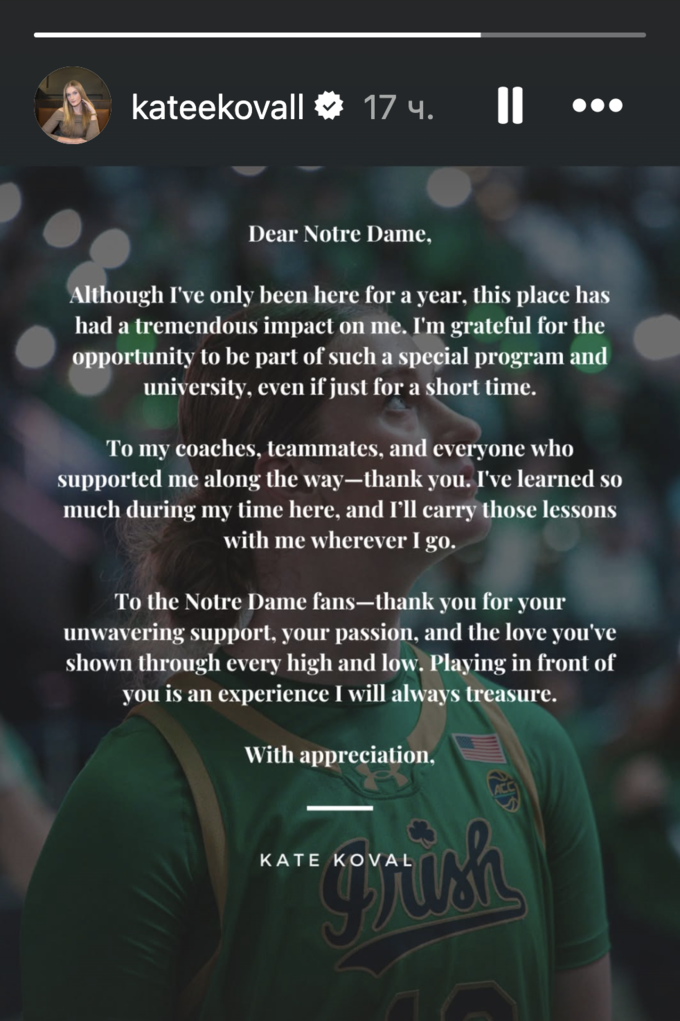 Українська баскетболістка клубу «Нотр-Дам» Катерина Коваль повідомила, що з наступного сезону змінить клуб.