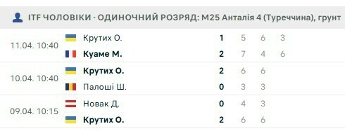 Український тенісист Олексій Крутих (ATP 539) дійшов до чвертьфіналу грунтового турніру ITF М25 в Антальї (Туреччина).
