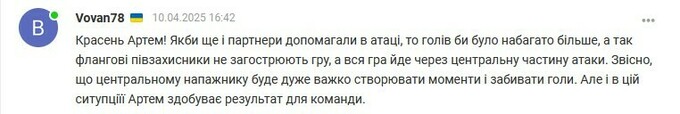 Vovan78: Красень Артем! Якби ще і партнери допомагали в атаці, то голів би було набагато більше, а так флангові півзахисники не загострюють гру, а вся гра йде через центральну частину атаки. Звісно, що центральному нападнику буде дуже важко створювати моменти і забивати голи. Але і в цій ситуації Артем здобуває результат для команди.