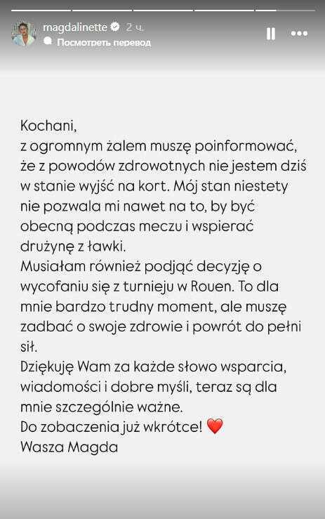 Я теж прийняла складне рішення знятися з турніру в Руані. Це дуже важкий момент для мене, але я маю подбати про своє здоров'я і повернення до нормальної форми. Дякую вам за кожне слово підтримки, за повідомлення і добрі думки – зараз для мене це особливо важливо. До зустрічі вже зовсім скоро!