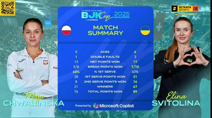 Світоліна принесла синьо-жовтим загальну перемогу в протистоянні з Польщею. Перше очко для нашої команди заробила Марта Костюк після перемоги над Катажиною Кавою.