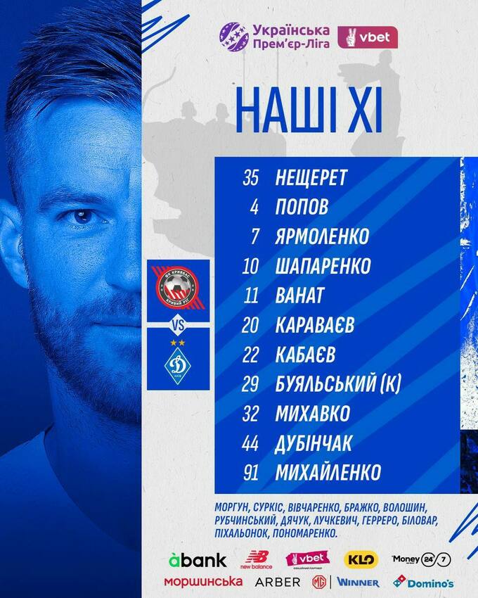 Запасні: Моргун, Суркіс, Вівчаренко, Рубчинський, Дячук, Лучкевич, Пономаренко.