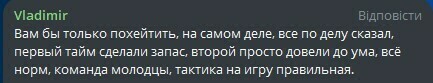 Vladimir: Вам би тільки похейтити, насправді все по справі сказав, перший тайм зробили запас, другий просто довели до розуму, все норм, команда молодці, тактика на гру правильна.