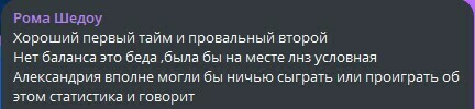Рома Шедоу: Хороший перший тайм і провальний другий. Немає балансу це біда, була б на місці ЛНЗ умовна Олександрія цілком могли б нічию зіграти або програти про це статистика і каже.