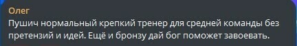 Олег: Пушич нормальний міцний тренер для середньої команди без претензій та ідей. Ще й бронзу дай боже допоможе завоювати.