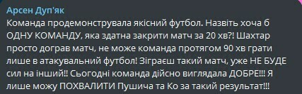 Арсен Дуп'як: Команда продемонструвала якісний футбол. Назвіть хоча б ОДНУ КОМАНДУ, яка здатна закрити матч за 20 хв?! Шахтар просто дограв матч, не може команда протягом 90 хв грати лише в атакувальний футбол! Зіграєш такий матч, уже НЕ БУДЕ сил на інший!! Сьогодні команда дійсно виглядала ДОБРЕ!!! Я лише можу ПОХВАЛИТИ Пушича та Ко за такий результат!!!