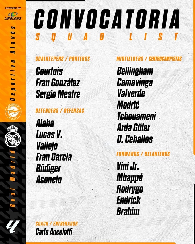 Стала відома заявка «вершкових» на цей матч. Поза заявкою на поєдинок опинився український воротар Андрій Лунін, який продовжує відновлюватися від пошкодження, отриманого у кубковому матчі проти «Реала Сосьєдад».