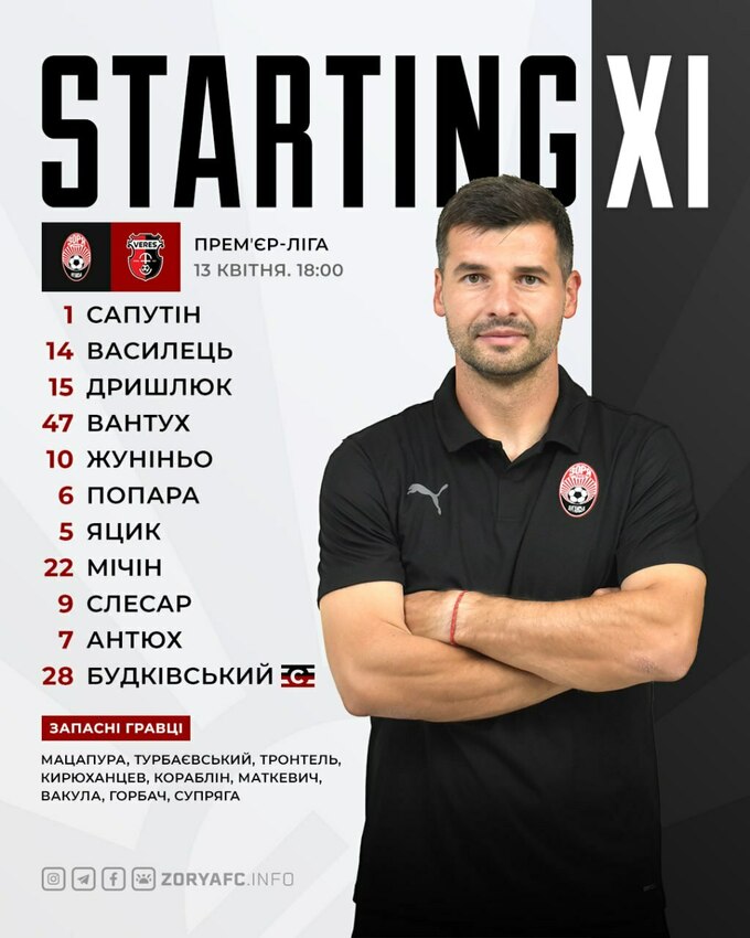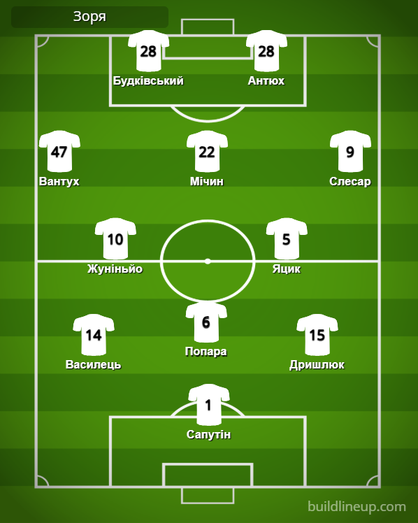 «Зоря»: Сапутін – Василець, Попара, Дришлюк – Вантух (Супряга, 85), Жуніньйо (Тронтель, 46), Яцик, Слесар (Горбач, 46) – Мічин – Будківський, Антюх (Кирюханцев, 73).