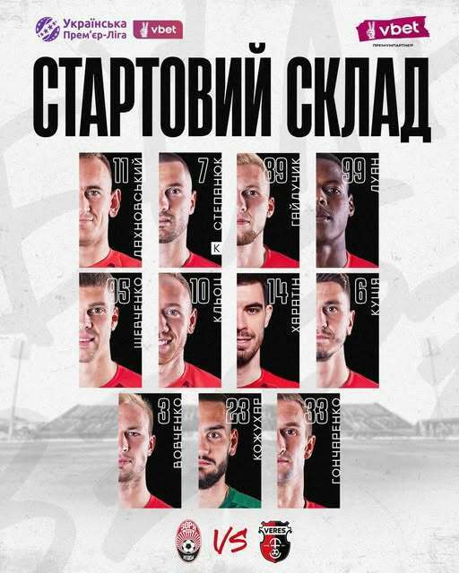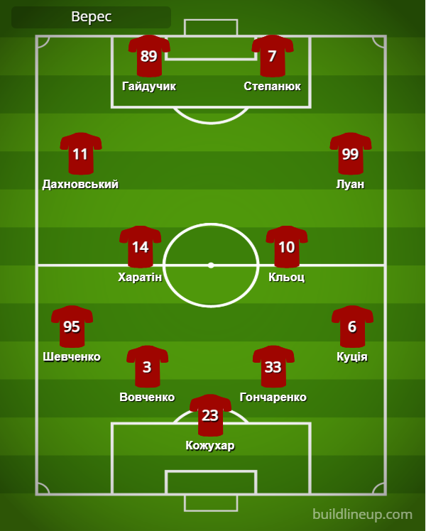 «Верес»: Кожухар – Шевченко, Вовченко, Гончаренко, Куція (Протасевич, 62) – Харатін, Кльоц (Балаба, 90+2) – Дахновський (Сміян, 79), Луан (Шарай, 62) – Гайдучик, Степанюк (Кучеров, 79).